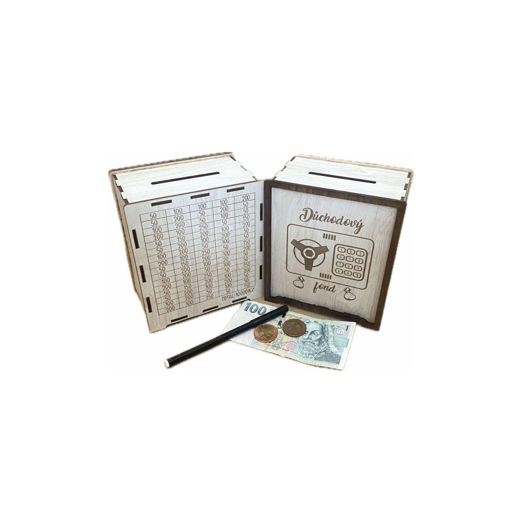 "Dřevěná pokladnička se škrtacím polem - "Důchodový fond" "