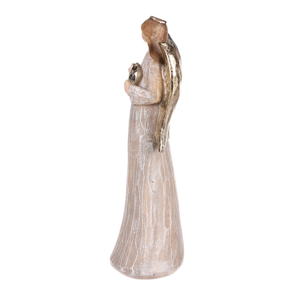 Anděl hnědý, zlatá křídla a srdce v ruce, polyresin