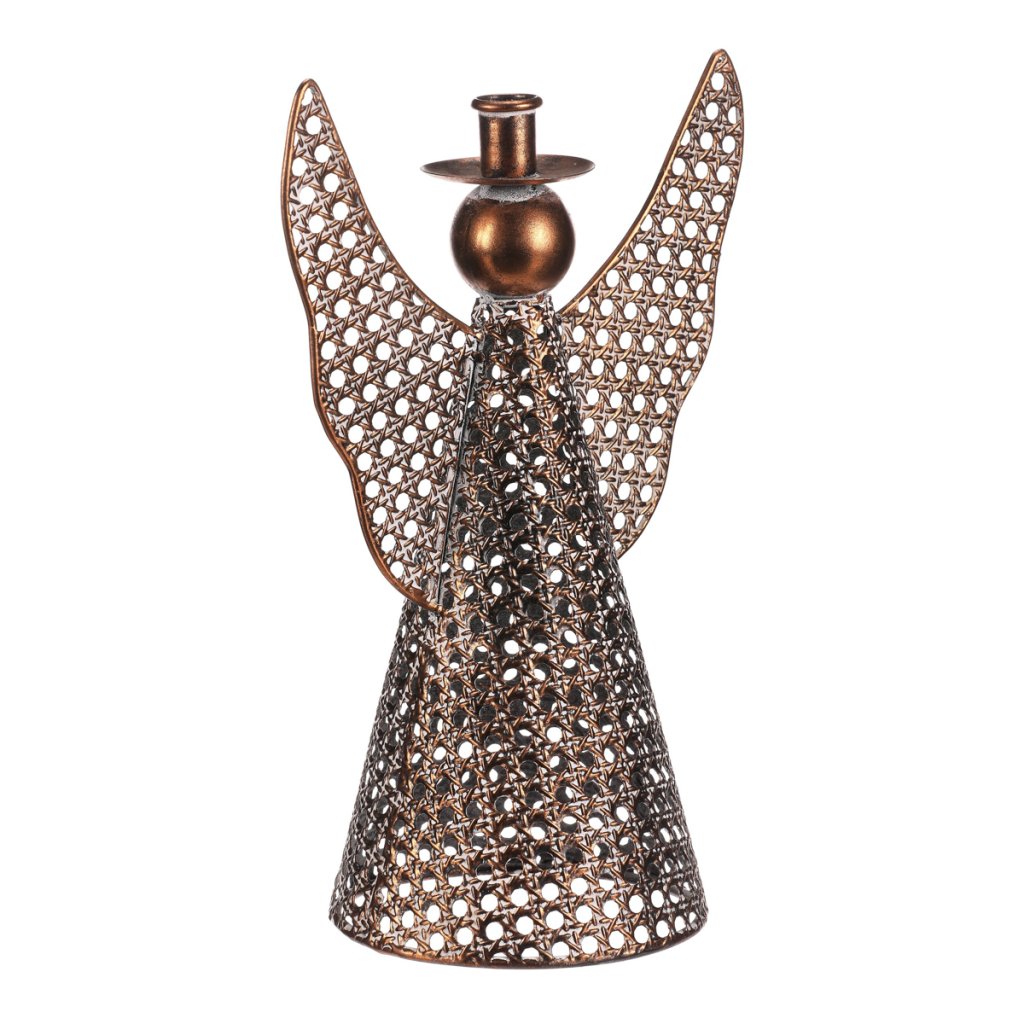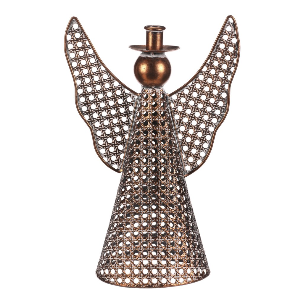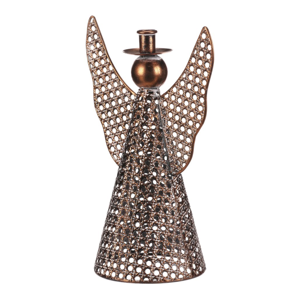 Kovový anděl vysoký přibližně 35 cm je elegantní vánoční dekorace v měděném odstínu. Na jeho kulaté hlavičce se nachází kalíšek přizpůsobený pro umístění kónické svíčky. Nabízí tak neodolatelnou kombinaci vkusné dekorace s možností vytvořit nádherný světelný efekt. Díky jemným kruhovým otvorům působí vzdušně a vkusně ozdobí váš interiér během svátečního období.