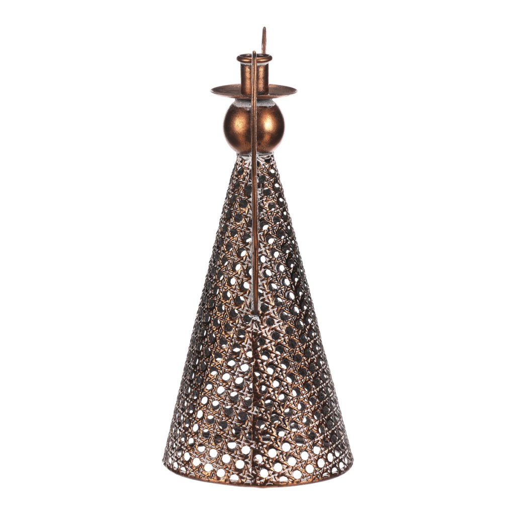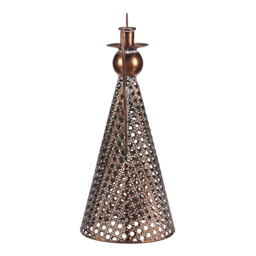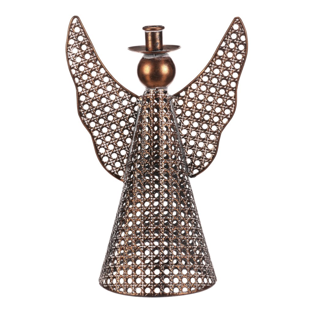 Kovový anděl vysoký přibližně 35 cm je elegantní vánoční dekorace v měděném odstínu. Na jeho kulaté hlavičce se nachází kalíšek přizpůsobený pro umístění kónické svíčky. Nabízí tak neodolatelnou kombinaci vkusné dekorace s možností vytvořit nádherný světelný efekt. Díky jemným kruhovým otvorům působí vzdušně a vkusně ozdobí váš interiér během svátečního období.