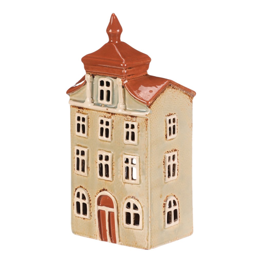 Keramický městský domek se světle zelenou fasádou a oranžovou střechou připomíná domy z malebných historických náměstí. Prostor na čajovou svíčku z něj dělá nejen krásnou dekoraci, ale i zdroj útulného světla, které bude jemně prosvítat skrze všechna okénka. Ideální dekorace pro podzimní a zimní večery.