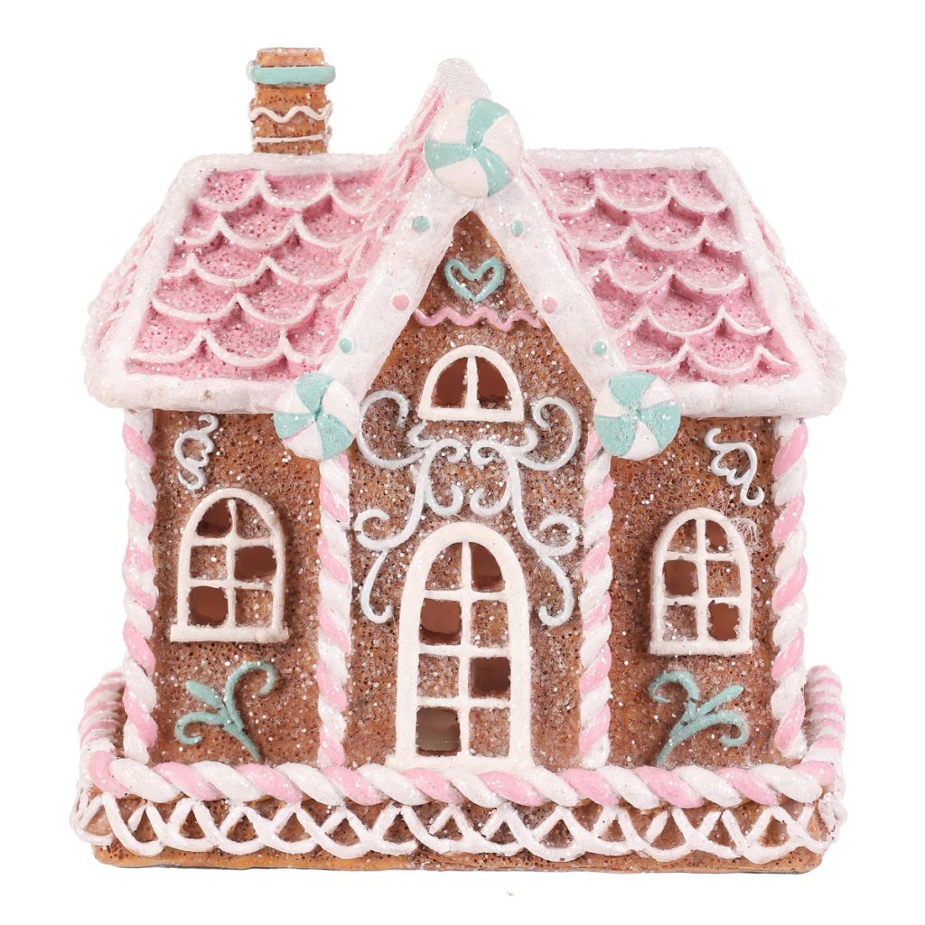 Domeček perníkový - polyresin, LED osvětl, hnědý s barevným zdobením