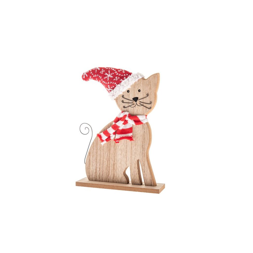 Dřevěná kočka s pletenou šálou a čepicí 29 cm 6/72