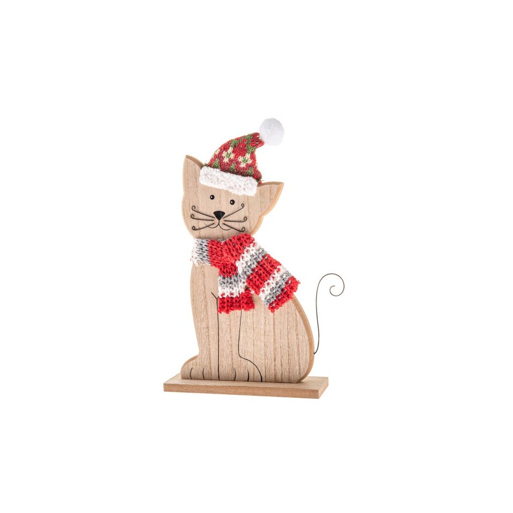 Dřevěná kočka s pletenou šálou a čepicí 29 cm 6/72