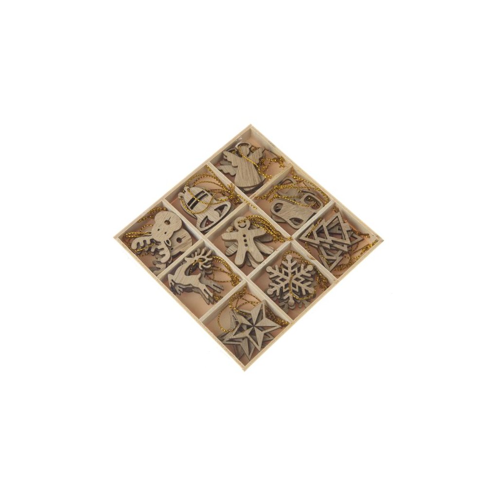 Dřevěné vánoční ozdoby v krabičce - natur - sada 36 ks 72/144
