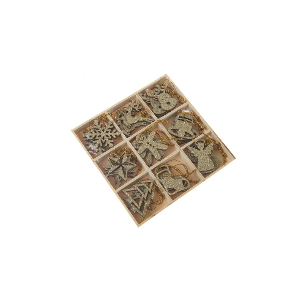 Dřevěné vánoční ozdoby v krabičce - zlatá - sada 36 ks 72/144