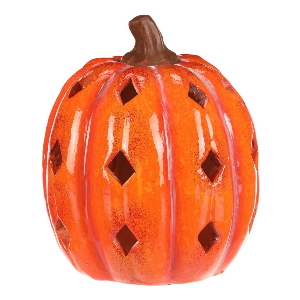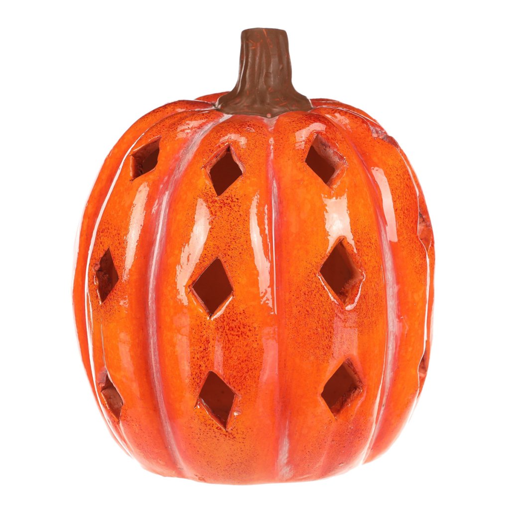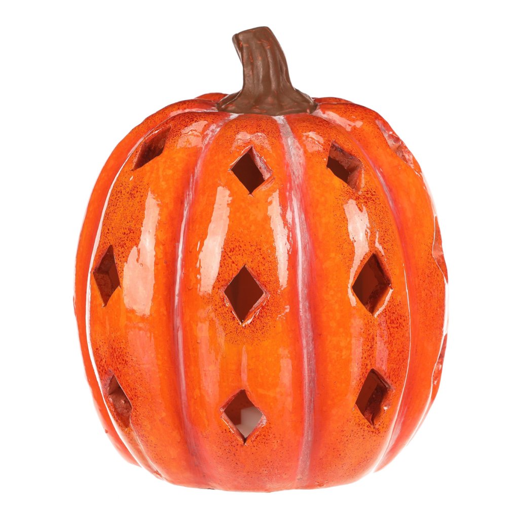Oranžová dýně z keramiky s lesklým povrchem a prostorem, ve kterém je umístěné LED osvětlení, navodí tu pravou podzimní atmosféru. Po obvodu se nachází hranaté otvory v prizích, kterými budou po rozsvícení umělé svíce efektně procházet paprsky světla.