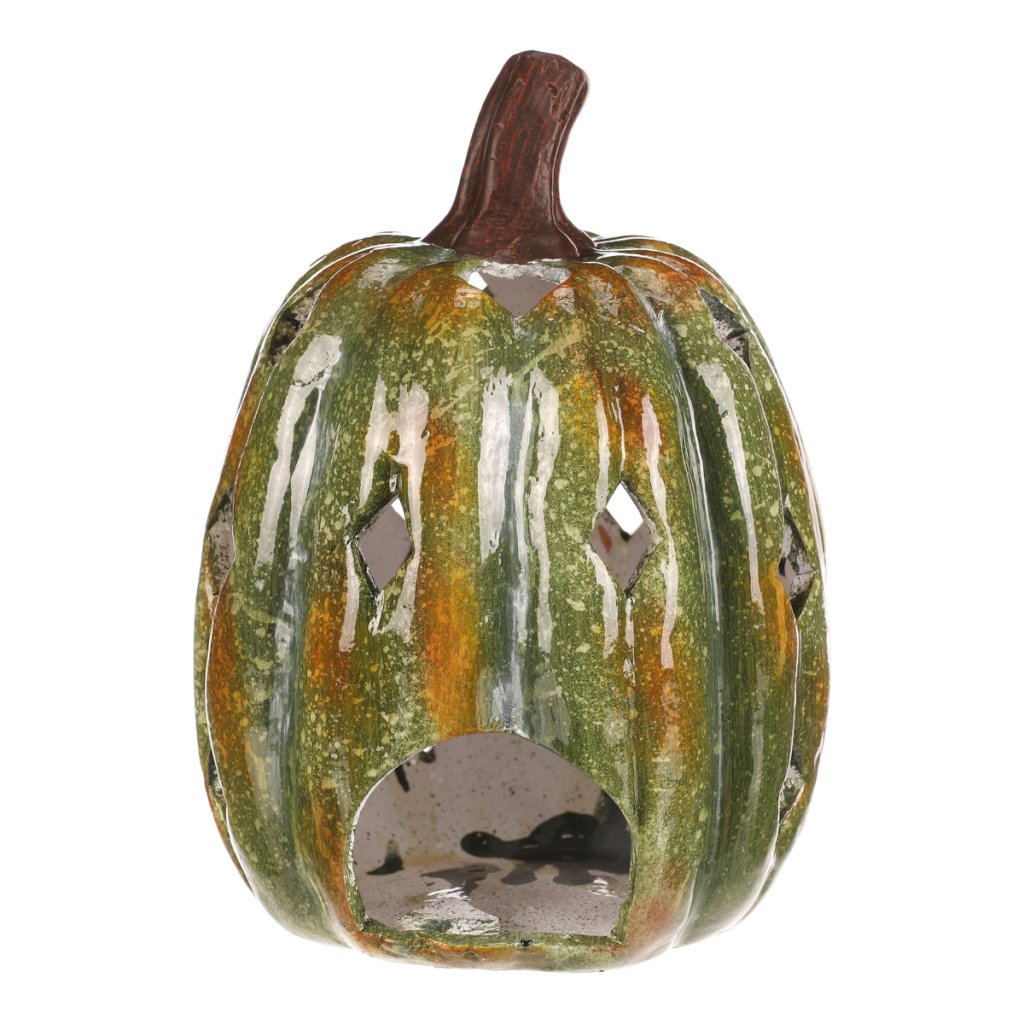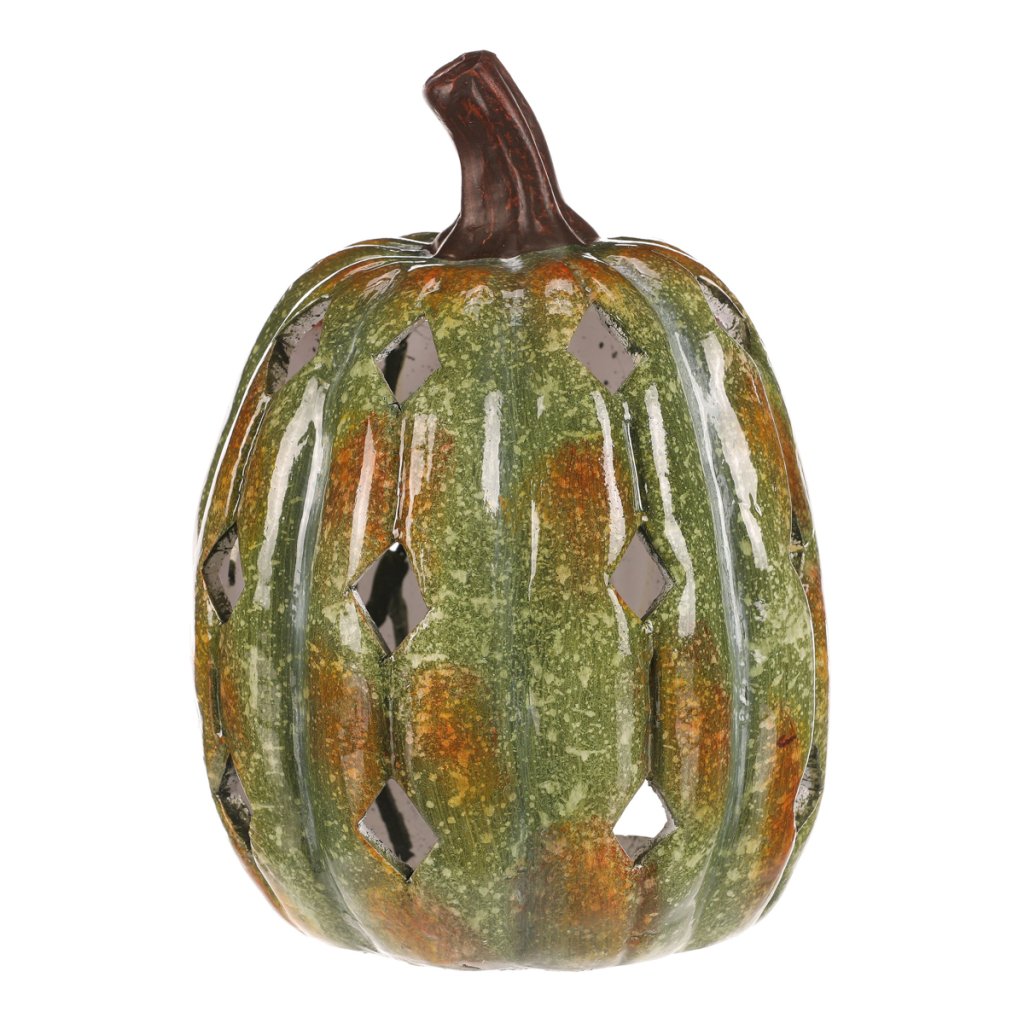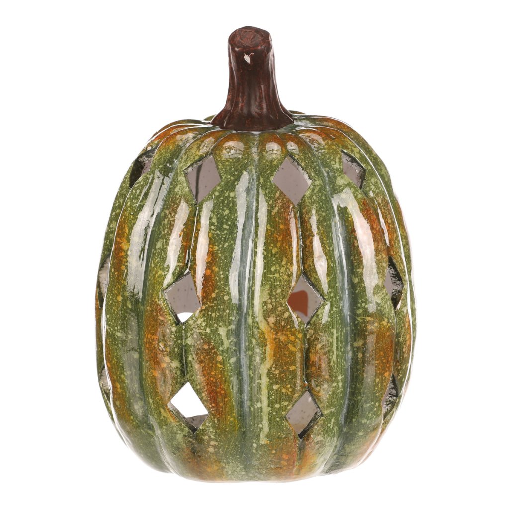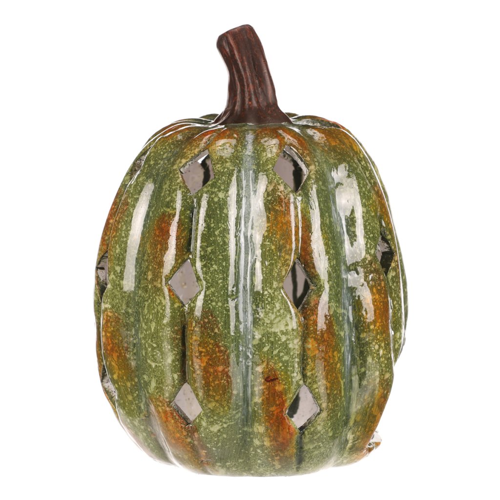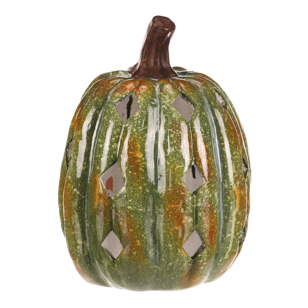 Zelená dýně z keramiky s lesklým povrchem a prostorem pro vložení svíčky navodí tu pravou podzimní atmosféru. Po obvodu se nachází hranaté otvory, kterými budou po zapálení knotu efektně procházet paprsky světla.