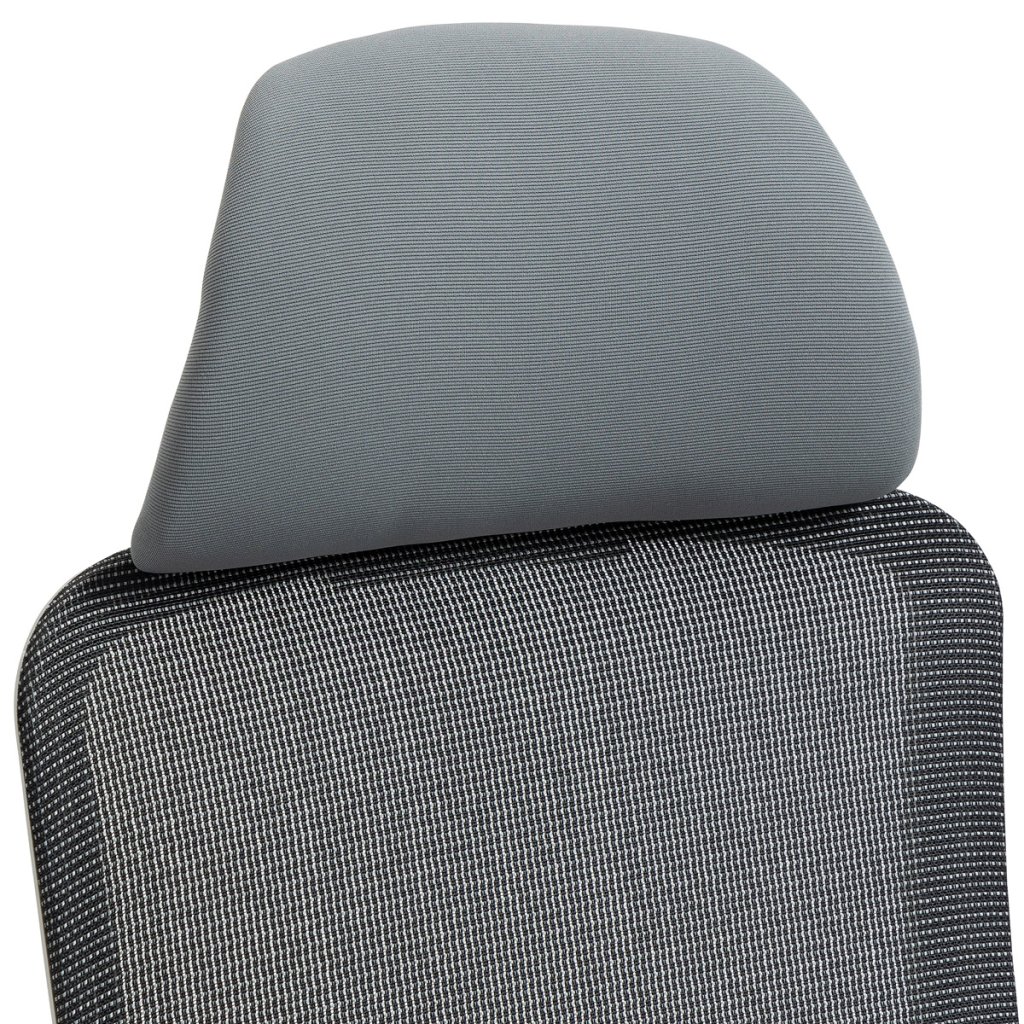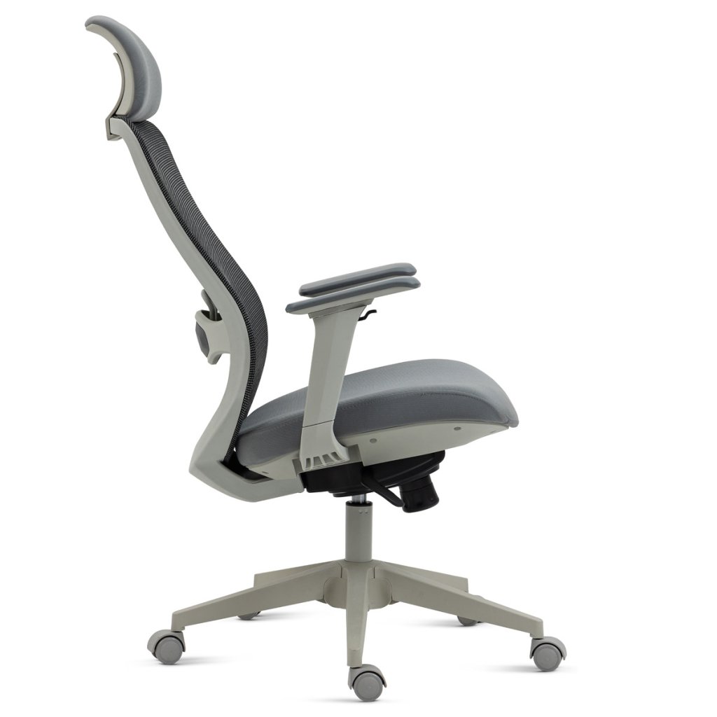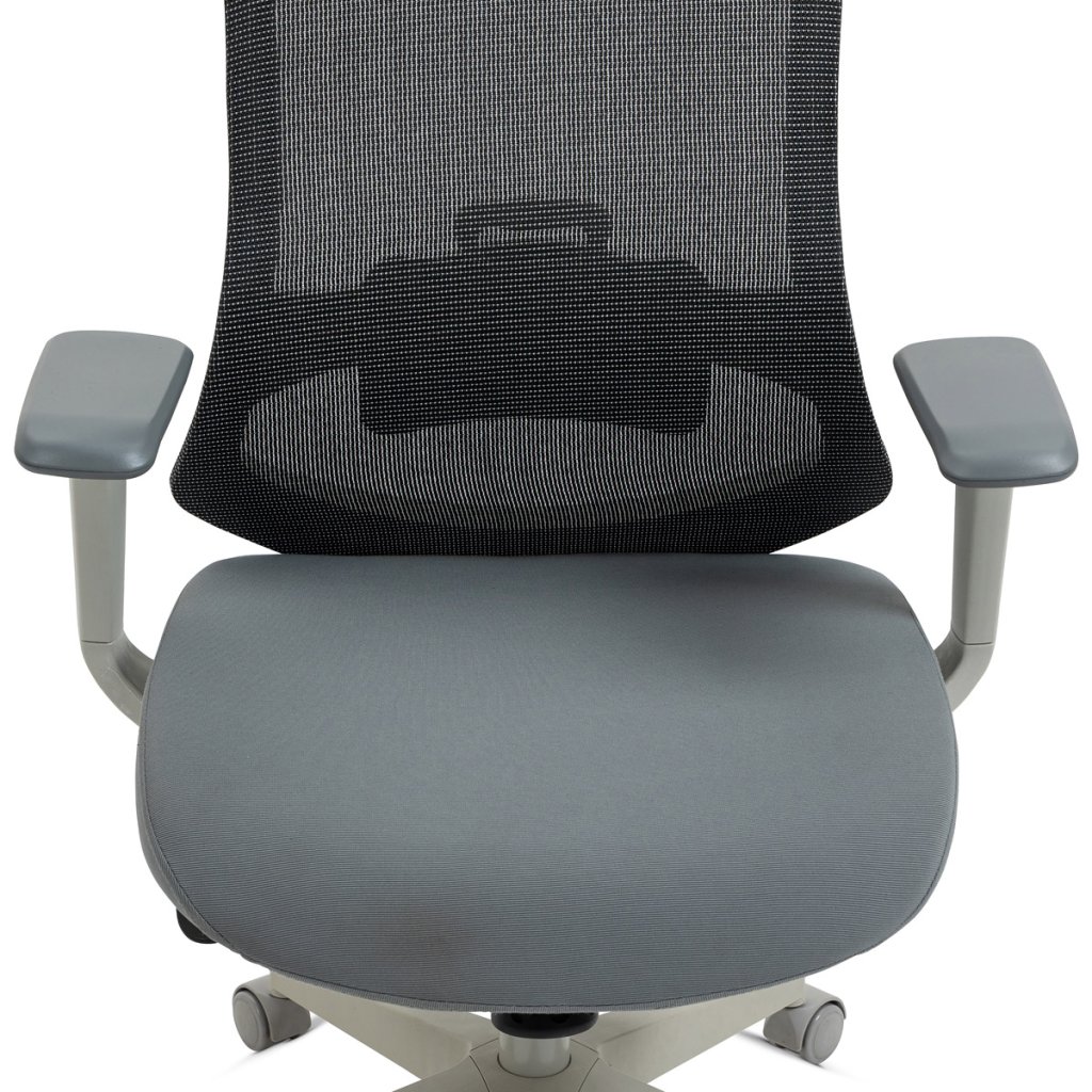 Sedák je vyměkčený, s potahem v šedé látce. Pro větší pohodlí je židle opatřena synchronní mechanikou s polohovací aretací, podhlavníkem a 4D područkami z vrchní části z PU pěny.