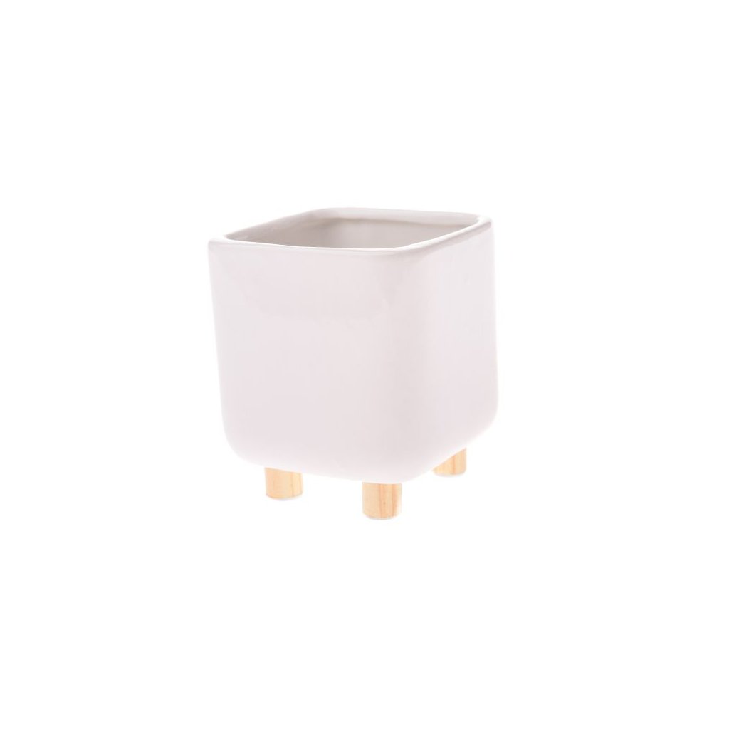 Keramický obal na květináč s dřevěnými nožkami bílý