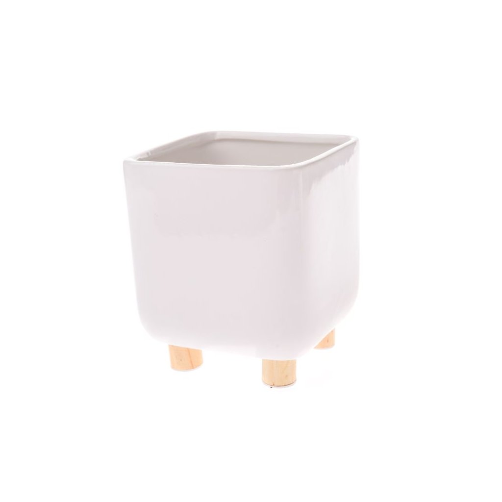 Keramický obal na květináč s dřevěnými nožkami bílý