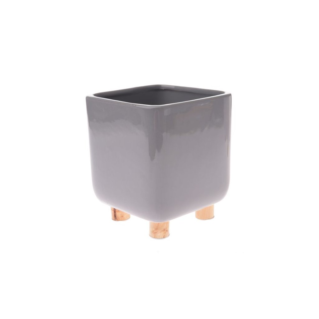 Keramický obal na květináč s dřevěnými nožkami šedý