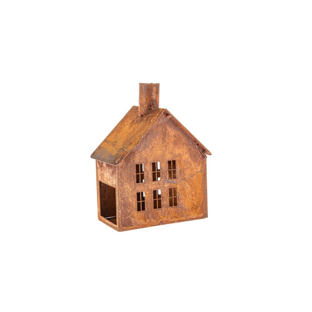 Kovový domek (svícen) s rezavým povrchem - 13 cm
