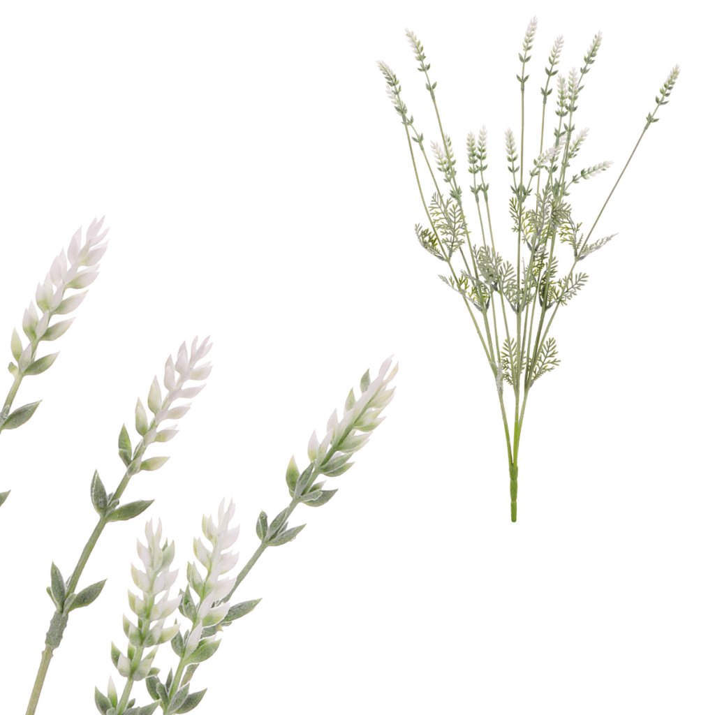 Levandule je všestranným darem přírody, který nabízí klid, krásu a smyslové potěšení. Náš trs umělých levandulových lístků s něžnými bílými květy předává všem aranžérům do rukou cenný nástroj pro dekorování věnců, stolních aranží, květinových vazeb a dokonce i pro zdobení truhlíků. Jejich přítomnost dodá vašim kompozicím nádech romantiky a sentiment spojený s příjemnými vzpomínkami na klidné chvíle strávené na venkovské chalupě.