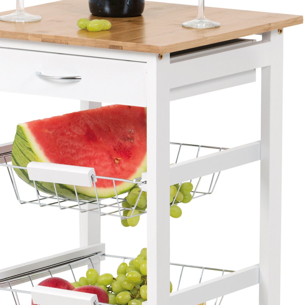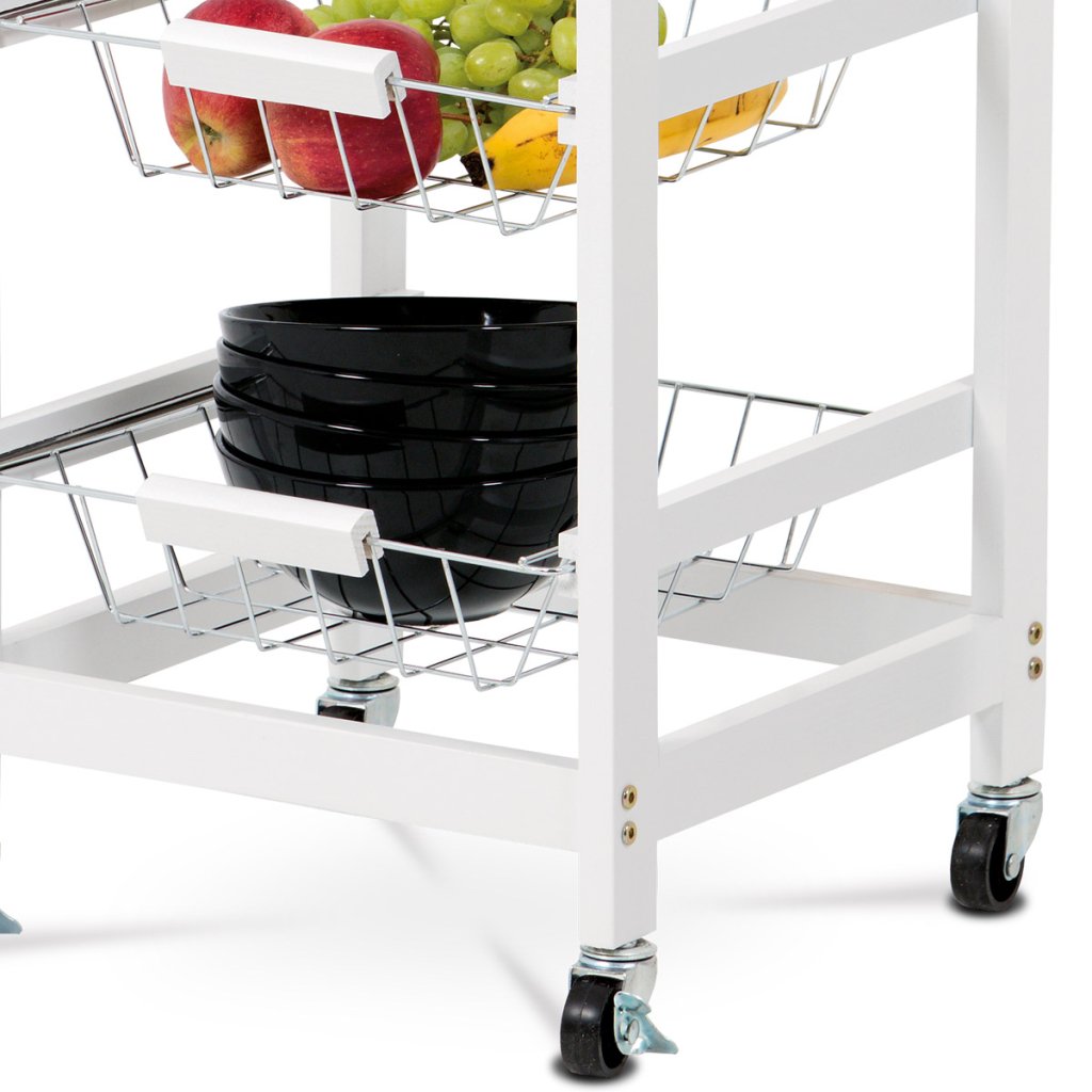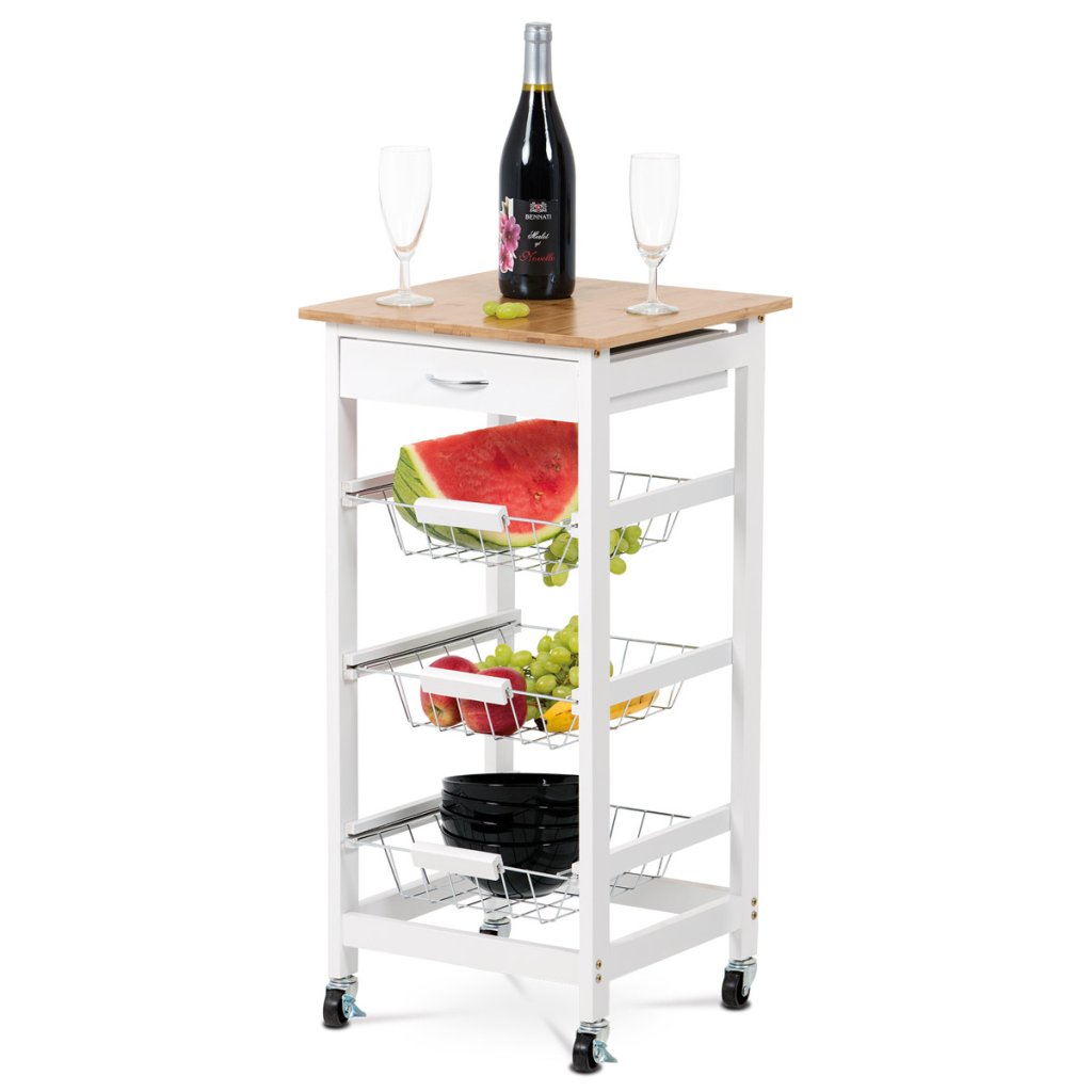 Konstrukce vozíku je z lakovaných MDF přířezů v bílé matné barvě. Kolečka jsou plastová, obě přední jsou opatřeny brzdičkami. Koše jsou svařené z kovových drátů a chromované. Velikost bambusové desky je 37 x 37 cm, což je příjemné zvětšení kuchyňské plochy a navíc mobilní.