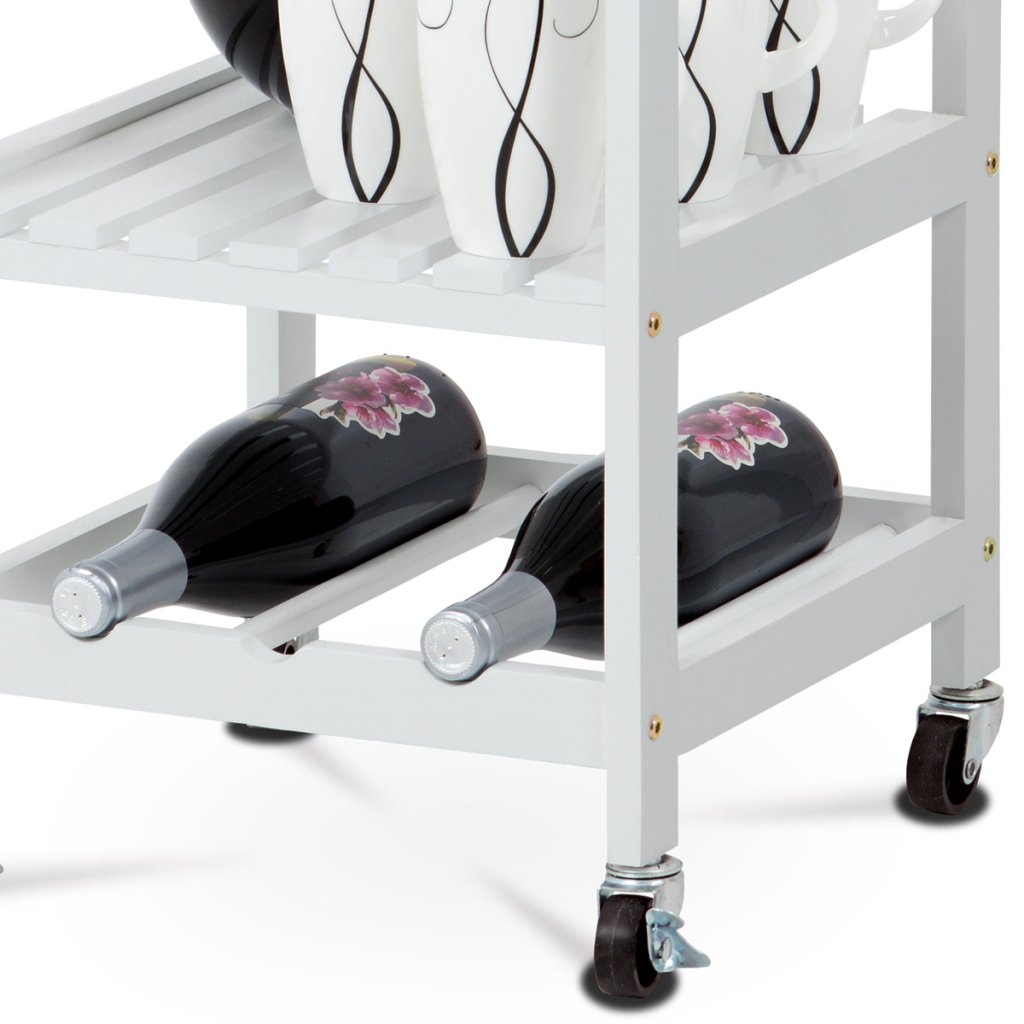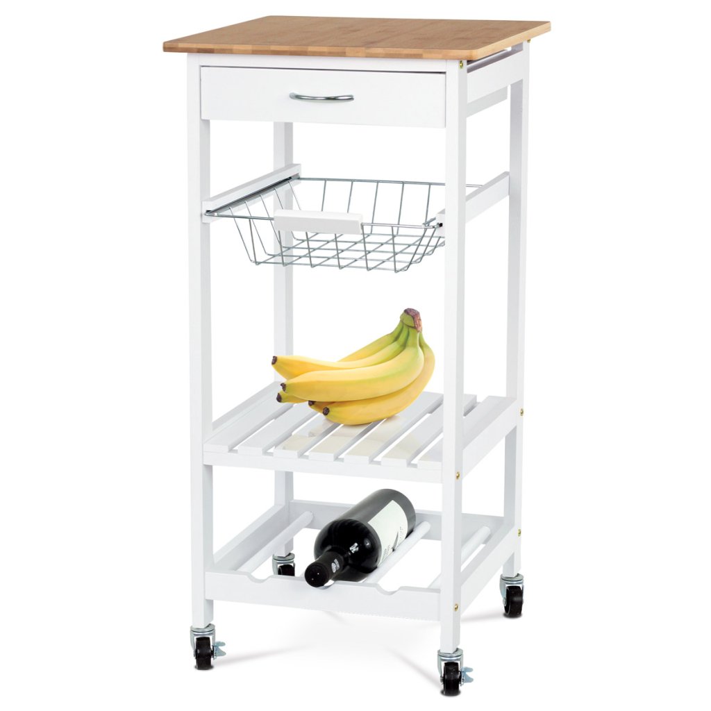 Servírovací stolek / regál, deska masiv bambus, MDF, bílý matný lak, pojezd