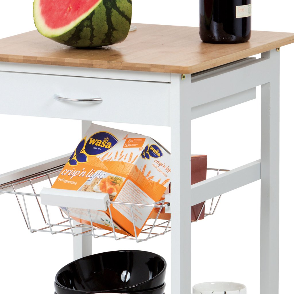 Konstrukce vozíku je z lakovaných MDF přířezů v bílé matné barvě. Kolečka jsou plastová, obě přední jsou opatřeny brzdičkami. Koš je svařený z kovových drátů a chromovaný. Velikost bambusové desky je 37 x 37 cm, což je příjemné zvětšení kuchyňské plochy a navíc mobilní.